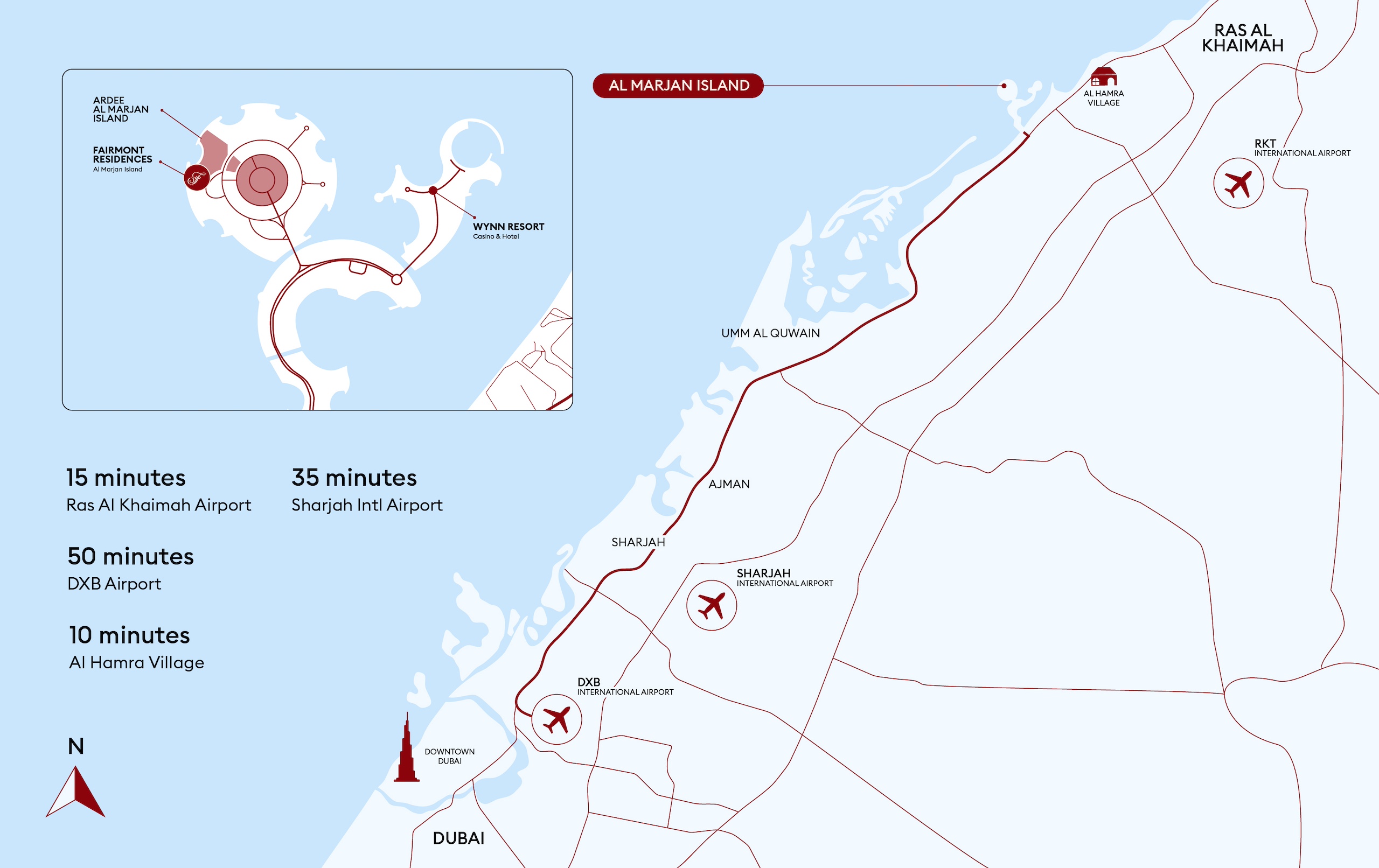 Nestled between the majestic Hajar Mountains and the serene Arabian Gulf, Ras Al Khaimah boasts breathtaking landscapes and a tranquil setting. Just 45 minutes from Dubai International Airport, the emirate offers a refreshing pace of life close to the world’s most dynamic city.