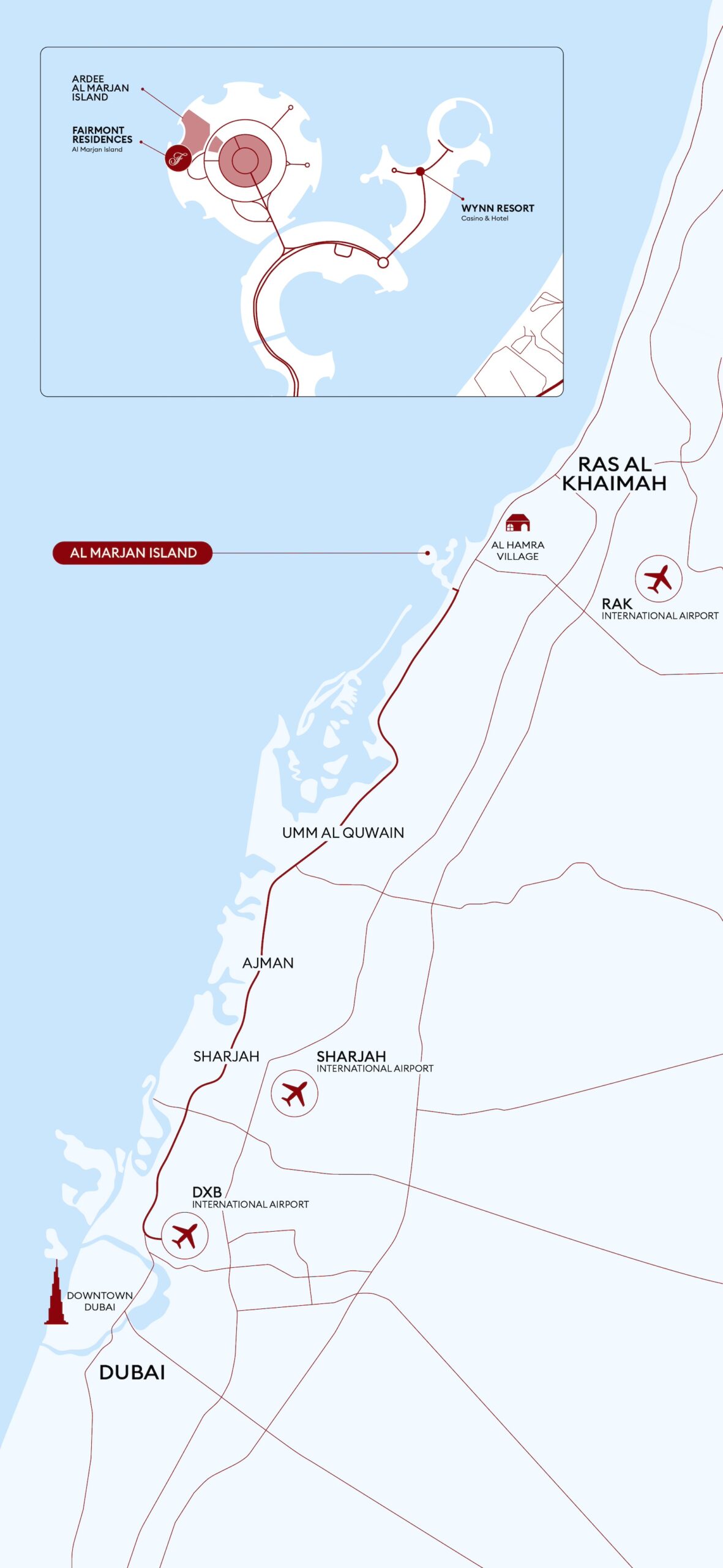 Al Marjan Island is a group of four man-made, coral-shaped islands in Al Jazirah Al Hamra, Emirate of Ras Al Khaimah, in the sun-kissed Persian Gulf. This waterfront haven is an unrivalled destination, a meticulously crafted archipelago with 7.8 kilometres of pristine beaches.